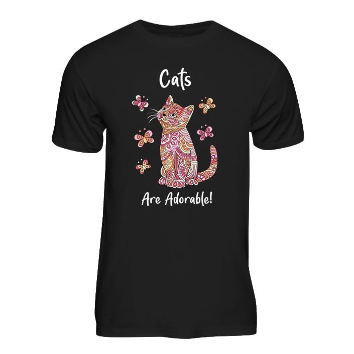Now you can express your love for these adorable feline creatures by getting this one of a kind “Cats Are Adorable!” T-Shirt that’s emblazoned with a beautiful colorful cat designed mandala pattern that depicts the cat looking curiously and innocently at beautiful butterflies!